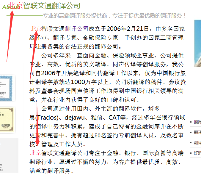 网站的原TDK里面标题不包含要做的北京翻译公司也无法匹配出来地区的词,所以要进行修改。